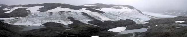 Uitzicht over de Ramnabergbreen (helemaal rechts op de foto) vanaf de Dyrhaugane.