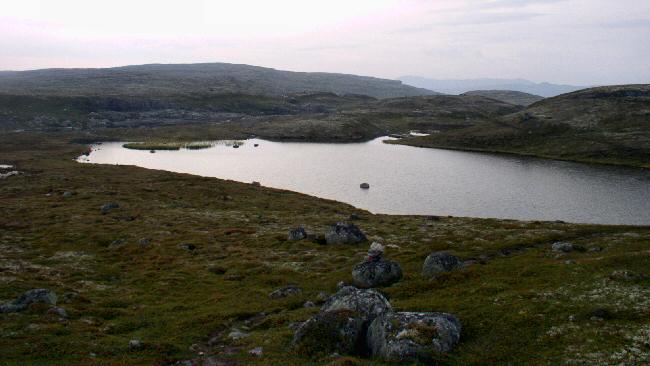 De noord oever van het Sysenvatnet. Hier begon tevens een steile en zeer modderige afdaling die eindigde op de zelfde hoogte als het meer.